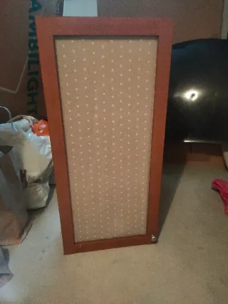 Mobiletto da parete con una cornice in legno e un pannello interno in sughero. - Cornice in legno marrone. - Pannello interno in sughero beige con fantasia a pois bianchi. - Dotato di ganci per appenderlo al miro - Sportello con vetro opaco.
