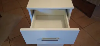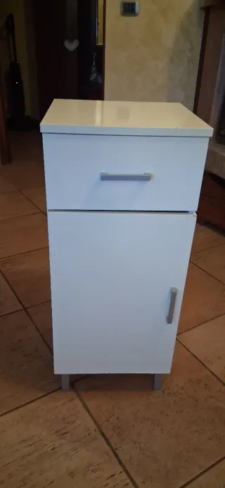 Mobiletto bianco lucido, ideale per il bagno o come comodino. Dimensioni 34 x 34 x 80 - Un cassetto superiore. - Una porta inferiore. - Maniglie argentate.