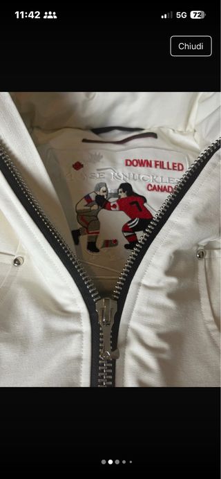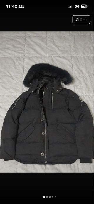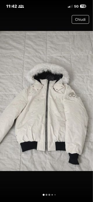 Giacca bomber con cappuccio bordato di pelliccia. - Logo Moose Knuckles sulla manica. - Zip frontale. - Polsini e fondo a costine neri.
