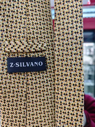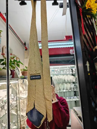 Cravatta in pura seta con fantasia. - Tessuto: Seta - Fantasia: Piccoli motivi neri su fondo giallo oro