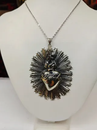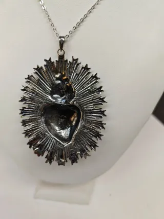 Bellissima collana con pendente a forma di Sacro Cuore di Gesù. In argento 925 - Pendente grande con dettagli elaborati. Cm8×5,8 - Design a raggiera. - Catena inclusa.