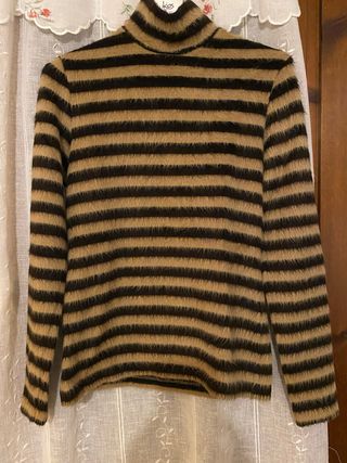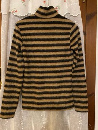 Maglia a maniche lunghe Benetton con fantasia a righe orizzontali. Il collo è alto e il tessuto è morbido e peloso. - Fantasia a righe marroni e nere. - Collo alto. - Tessuto effetto pelo.