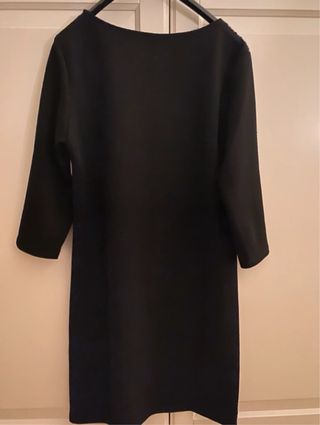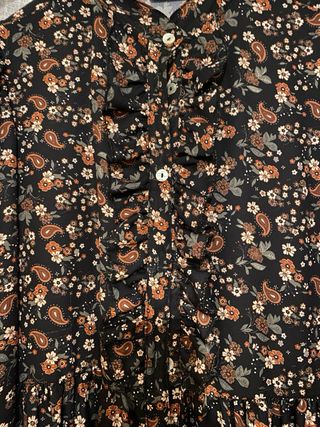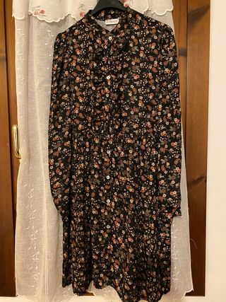 Elegante vestito da donna con una fantasia floreale su fondo nero. - Chiusura con bottoni sul davanti. - Dettaglio volant sul davanti. - Maniche lunghe. - Cintura elasticizzata per eventuale arricciatura in vita. - usato una volta. - taglia S/M