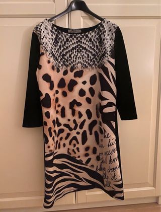 Elegante abito da donna con una vivace fantasia. - Maniche lunghe nere. - Fantasia animalier sul davanti con serpente, leopardo e zebra. - Dettagli con scritte.