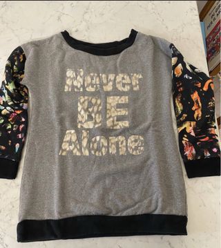 Felpa da donna con stampa Never BE Alone. - Maniche lunghe con fantasia. - Girocollo. - Fondo e polsini a costine.