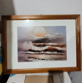 Quadro con una scena marina e un tramonto. Misure 56x41 - Cornice in legno. - Stampa su carta.