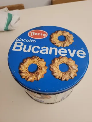 Scatola vintage in metallo per biscotti. Contiene moltissimi bottoni di tanti tipi - Design con biscotti e logo. - Coperchio blu con scritta Bucaneve.