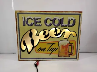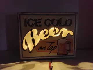 Piccola insegna luminosa con la scritta beer Non so datario ma in base al tipo di lampadine che monta ritengo sia degli anni 70 Funzionante ed alimentata con due batterie stilo (fornitee con interruttore laterale Materiale per lo più legno Misura 40 x 32 x 4 cm circa Le foto sono parte integrante della descrizione