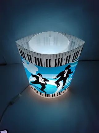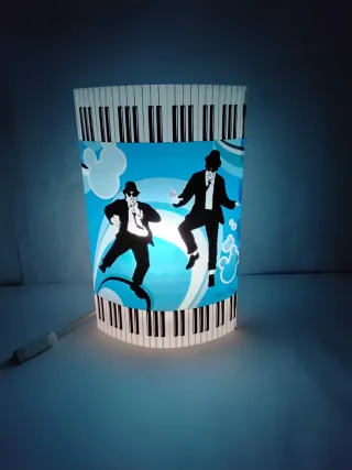 Lampada da tavolo in materiale plastico Raffigura nella parte superiore ed inferiore dei tasti di pianoforte mentre nella parte centrale è in ambedue i lati sono raffigurati i blues brothers Funzionante e corredata di lampadina colorata in blu Misura 36 x 22,5 x 11 cm circa Le foto sono parte integrante della descrizione