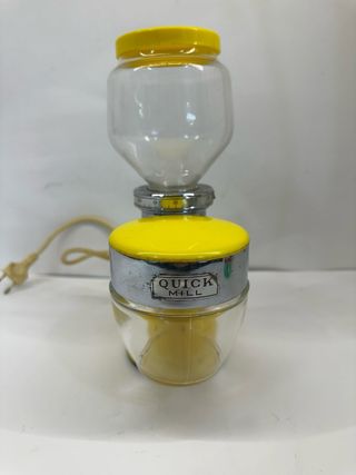 Macinacaffè vintage Quick Mill di colore giallo brillante. Un pezzo di design che aggiunge un tocco retrò alla tua cucina. - Corpo in metallo verniciato giallo. - Coperchio e contenitore superiore in plastica trasparente. - Dettagli cromati lucidi. - Contenitore raccogli caffè in vetro. benché sia funzionate é privo della lama le foto sono parte integrante della descrizione