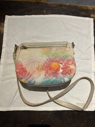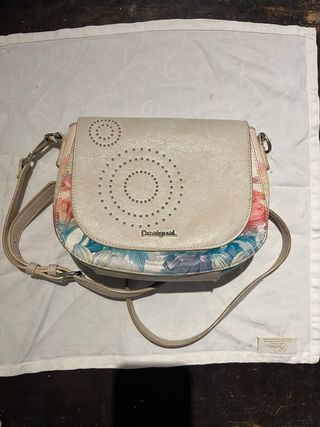 Borsa Desigual con stampa floreale e dettagli in borchie. - Colore principale beige con accenti multicolor. - Design a tracolla con tracolla regolabile. - Chiusura compatta. - Logo Desigual (originale) visibile sul davanti. - Chiusura della borsa che si può cambiare (inclusa) - Unico difetto: piccola macchia sul retro, vicino alla cerniera posteriore, appena visibile (vedere foto)