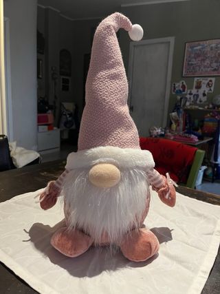 Adorabile peluche a forma di gnomo, perfetto per aggiungere un tocco di allegria. - Cappello a punta rosa in maglia. - Barba bianca folta. - Dettagli a righe sulle maniche. - Piedini e naso in tessuto rosa.