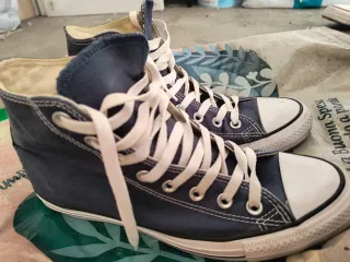 Scarpe Converse All Star alte. - Tomaia in tessuto blu. - Lacci bianchi. - Puntale bianco in gomma. - Suola in gomma bianca.