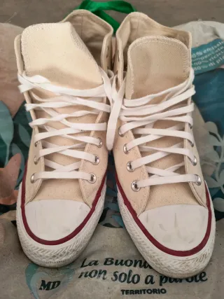 Scarpe Converse All Star alte. - Tomaia in tela beige. - Dettagli rossi sulla suola e sul tallone. - Lacci bianchi.