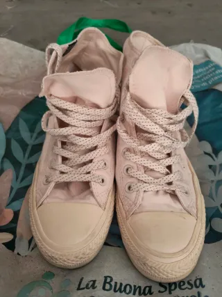 Scarpe Converse All Star alte. - Colore rosa vivace. - Lacci bianchi. - Punta bianca in gomma.