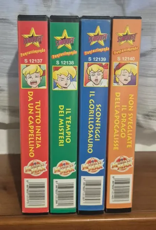 Vendo 4 VHS della serie Stardust Fantastimondo. - Tutto Inizia da un Cappellino (S 12137) - Il Tempio dei Misteri (S 12138) - Sconfiggi il Gorillosauro (S 12139) - Non Svegliate il Drago dell'Apocalisse (S 12140)