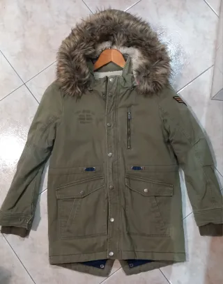 Taglia 14 anni/164 cm Elegante giubbotto invernale con cappuccio bordato in pelliccia sintetica. - Chiusura centrale con zip e bottoni. - Due tasche frontali con patta e bottone. - Tasca verticale con zip sul petto. - Patch decorativa sulla manica.