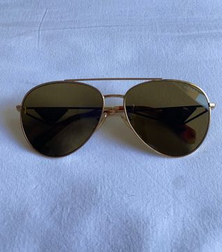 Occhiali da sole Prada modello: PR 73ZS. L'occhiale possiede una forma "pilot", con lenti a goccia molto vintage racchiuse in una struttura sottile e affusolata con un doppio ponte. La montatura è realizzata in metello dorato con dettagli geometrici e icona laterale Prada Milano. In mezzo alle lenti possiamo trovare una coppia di naselli regolabili e anti scivolo, così come i terminali alla fine delle aste, su cui è inciso il logo del brand. Materiale lenti: polimmide Colore: loden Taglia: - calibro: 61mm - ponte: 14mm - lunghezza asta: 140mm Non verrà venduto con la custodia originale in quanto sottratta in seguito ad un furto.