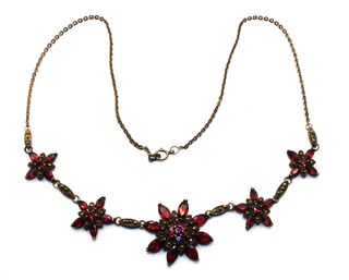 Questo stupendo collier in stile Art Déco rappresenta un perfetto connubio di eleganza vintage e maestria artigianale. Realizzato in argento, il gioiello si distingue per una raffinata struttura a maglia sottile che culmina in una composizione floreale di straordinaria bellezza. Il design è caratterizzato da cinque elementi a corolla degradanti verso il centro, dove spicca un fiore principale più grande, finemente lavorato. Ogni petalo è impreziosito da luminosi granati naturali dal taglio marquise, la cui calda e profonda tonalità rosso cremisi crea un contrasto magnetico con il bagliore metallico del supporto.