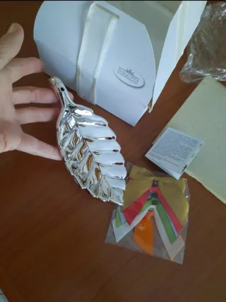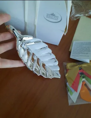Elegante foglia decorativa della serie "Foglie" di Bagutta, finitura simil-argento. È la foglia di alloro, con nastri-fiocchetti multicolori intercambiabili. Nuova con scatola-fiocco originale e certificato di garanzia. La scatola ha un piccolo strappo (vedi foto). Misure foglia cm 18,5 x 8