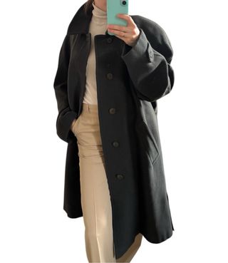 Elegante cappotto sartoriale nero. Caldo e pesante, foderato, sartoriale, il tessuto 100% lana . Veste L-XL controllate le misure per favore. Misure: Ascelle 63 cm Lunghezza 103 cm Manica 59 cm Spalle 50 cm - Linea classica e raffinata. - Tessuto di alta qualità. - Chiusura doppiopetto con bottoni.