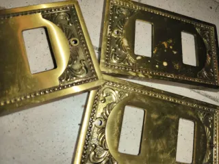 Placche Vallicombo B Ticino da 1 - 2 - 3 moduli per un totale di 19 pezzi (15 da 1 modulo, 3 da 2 e 1 da 3). Copri interruttori realizzati in ottone o bronzo con una finitura decorativa e sono progettate per coprire gli interruttori elettrici. Queste placche sono compatibili con i supporti Magic BTicino e sono disponibili in configurazioni da 1 3 posti. Sono considerate oggetti vintage o antichi, risalenti potenzialmente agli anni '60/'70. Questi oggetti sono robusti e pesanti, a differenza delle moderne placche in plastica.