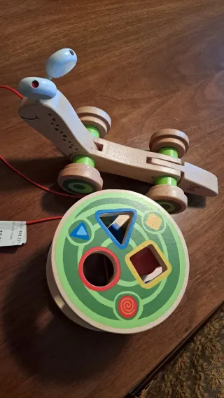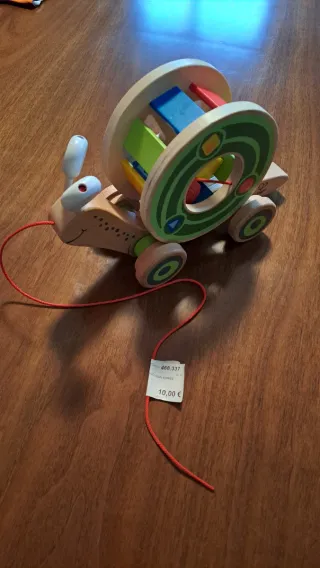Divertente lumachina in legno, perfetta per i più piccoli. Un classico gioco per sviluppare la coordinazione. - Materiale: legno. - Design colorato con forme geometriche. - Include cordino per tirarla.