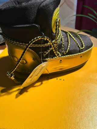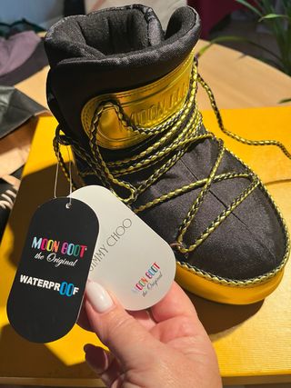Scarpe Moon Boot originali, una collaborazione esclusiva con Jimmy Choo. - Design in nero e oro. - Impermeabili.